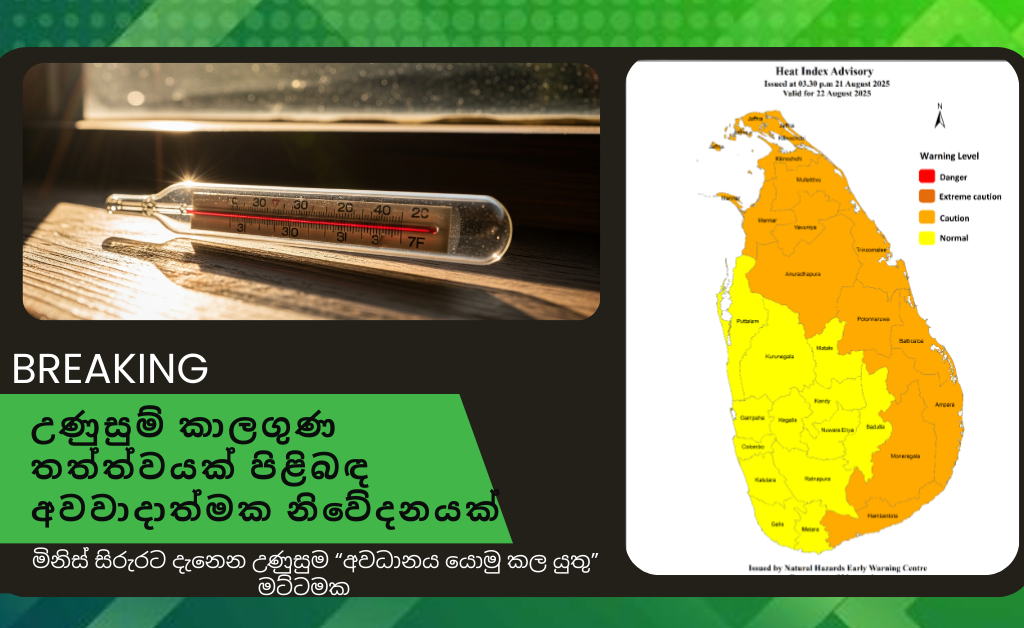 කාලගුණ විද්යා දෙපාර්තමේන්තුව විසින් උණුසුම් කාලගුණ තත්ත්වයක් පිළිබඳ අවවාදාත්මක නිවේදනයක් නිකුත් කර තිබෙනවා. එම නිවේදනයේ සඳහන් වන්නේ උතුරු, උතුරු-මැද , නැගෙනහිර පළාත් සහ හම්බන්තොට හා මොණරාගල දිස්ත්රික්කවල ඇතැම් ප්රදේශ වල උණුසුම් දර්ශකය එනම් මිනිස් සිරුරට දැනෙන උණුසුම “අවධානය යොමු කල යුතු” මට්ටමක පැවතිය හැකි බවයි. මෙලෙස උණුසුම් කාලගුණයක් පවතින අවස්ථාවකදී වැඩ…